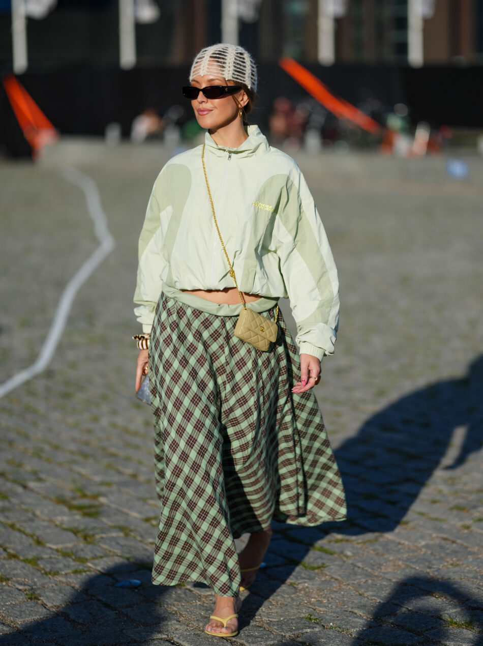 O visual monocromático traz a windbreaker verde combinada a uma saia mídi xadrez no mesmo tom. A escolha cria harmonia de cores e eleva o look, provando que até uma peça esportiva pode dialogar com propostas mais clássicas.