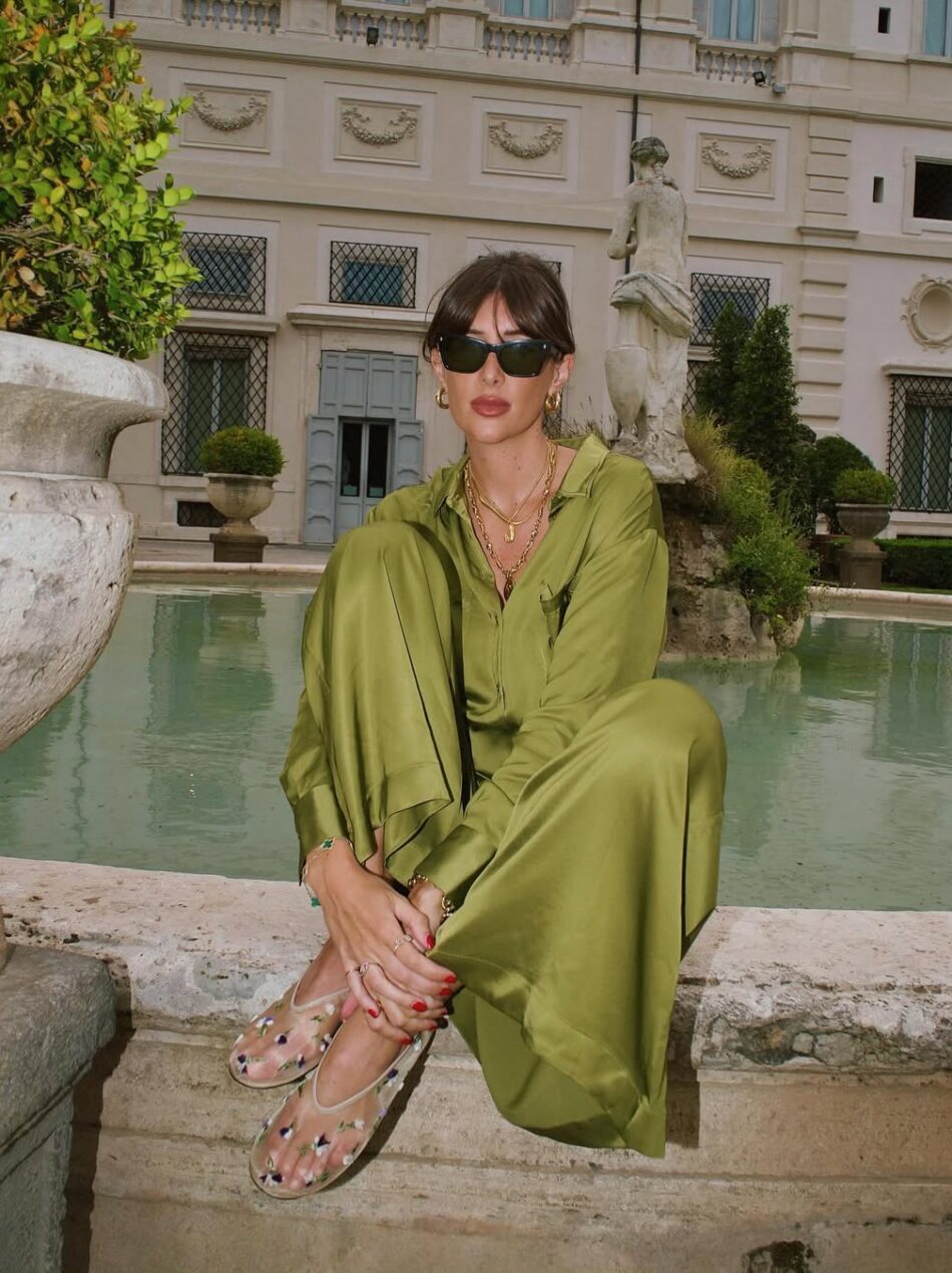 Os conjuntos são uma forma prática e fácil de incorporar o sapato do momento. Em versões com estética de pijama, carregam uma sofisticação leve, que cria um match bem pensado com a sapatilha de tela transparente – que fica ainda mais charmosa com delicados apliques de flores. Uma combinação que transita do dia à noite com naturalidade.