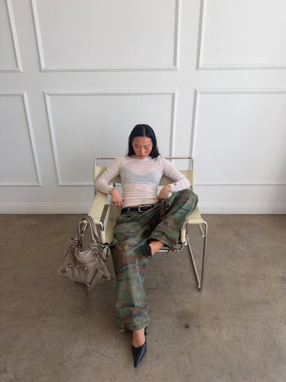 A calça cargo combina conforto e atitude e ganha força no contraste com peças mais leves, como a blusa transparente acima. A bolsa motorcycle reforça a pegada edgy, enquanto o scarpin entra como elemento surpresa de sofisticação.