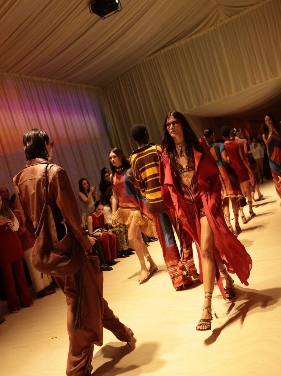 A noite da última quarta-feira (27.08) foi marcada por experiências sensoriais no evento da Animale, em São Paulo. A etiqueta escolheu lançar sua nova coleção, a de verão 2026, em um verdadeiro oásis. Ao entrar no espaço, um refúgio no meio da cidade, os convidados passavam por um túnel dividido em módulos: havia um lugar para assistir ao fashion film da campanha, um ambiente que imitava um luau contemporâneo e projeções de sol, água e paisagens. A cantora Luedji Luna também apresentou canções de seu repertório e sucessos da MPB.