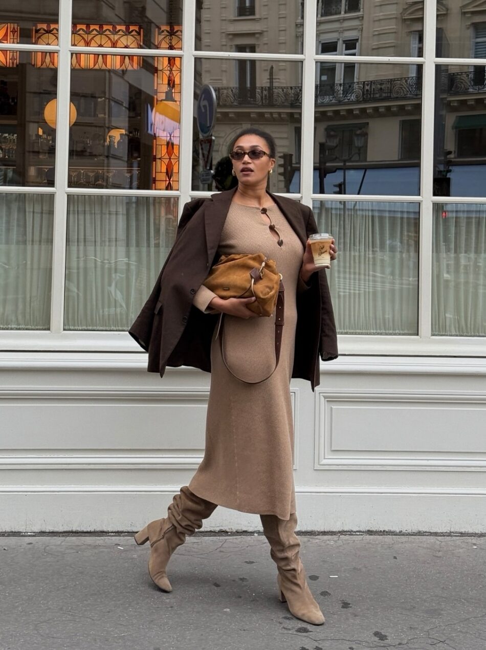 Apostar na bota dentro da mesma paleta do look cria uma silhueta contínua e alongada. A textura e o volume do sapato são suficientes para criar um ponto de interesse, sem que seja preciso lançar mão de grandes inovações na paleta de cores.