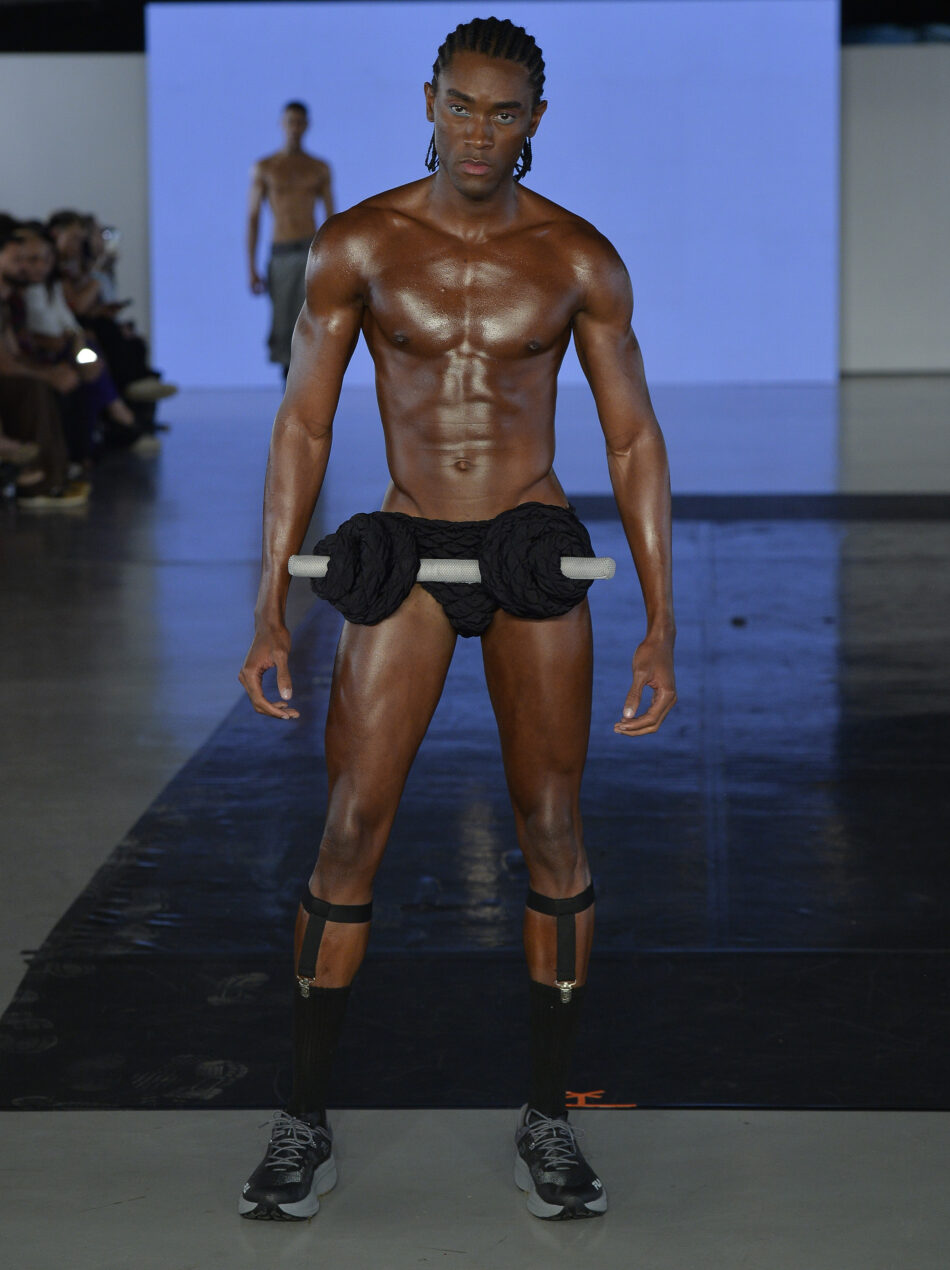 O número começa com jeito de desfile, mas rapidamente vira uma composição artística, com saltos e piruetas. Os intérpretes trocam de look ao longo do ato. As peças, embora não dialoguem diretamente com o balé, são esportivas e encontram na dança um ponto de conexão. A temática, na verdade, está mais próxima da malhação – outra paixão do designer. Alguns movimentos dos dançarinos remetem à ginástica, enquanto uma cueca aparece com um haltere feito de tecido e acoplado na parte frontal. Há regatas cavadas, macacões justos, calças e shorts com cós de elástico e uma camiseta com a estampa de um homem musculoso.