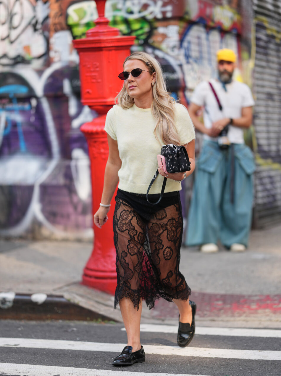 A leveza da renda e a casualidade da camiseta encontram equilíbrio no mocassim. Ele adiciona peso visual e sofisticação, transformando a combinação em algo moderno e nada óbvio.