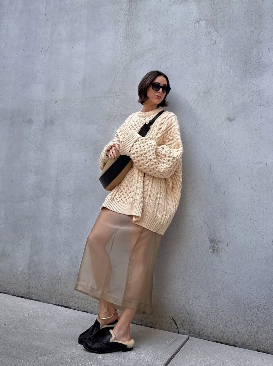 As saias transparentes aparecem em diferentes versões – e as estampadas garantem um charme extra. Para um toque cool e sofisticado, vale combiná-las com blusas de lã e loafers, trazendo uma leitura preppy atualizada.
