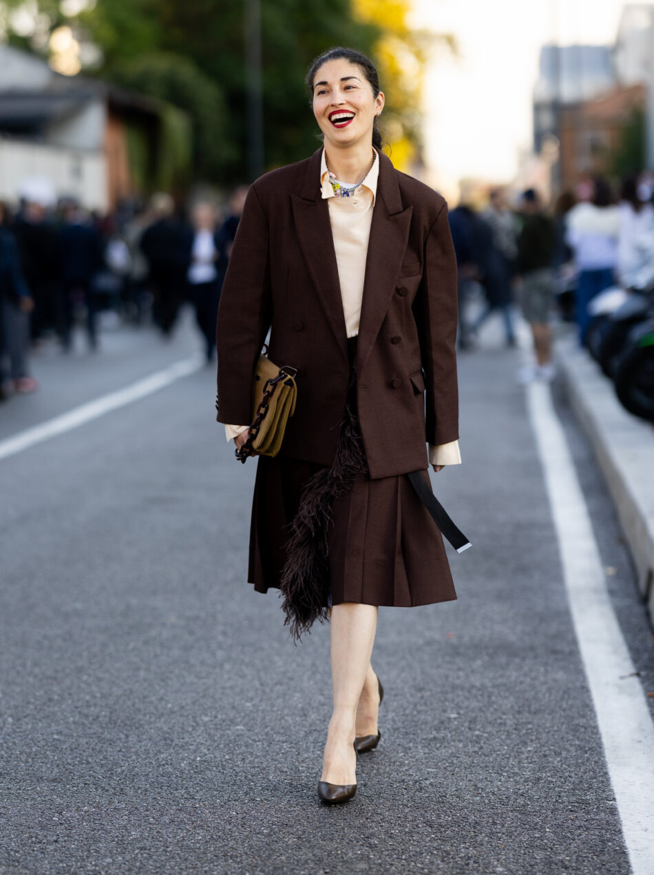 O conjunto em marrom ganha textura e movimento com a saia mídi plissada, resultando em uma estética sofisticada e leve. Os escarpins completam a produção com elegância discreta, criando um visual perfeito para ambientes profissionais – mas ainda assim fashionista.