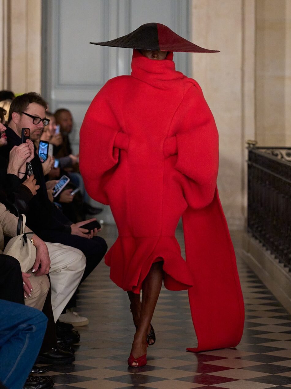 As esculturas de ovelhas felpudas de François-Xavier Lalanne são traduzidas em bolsas que reproduzem o animal tanto na forma quanto na textura. No final da apresentação, a fotografia de Paloma Picasso (filha do célebre artista espanhol) feita por Helmut Newton em 1973 ganha releitura performática. Na imagem original, ela posa com uma taça cobrindo um dos seios. Na passarela, uma modelo usa um vestido midi preto, de um ombro só e supercavado.