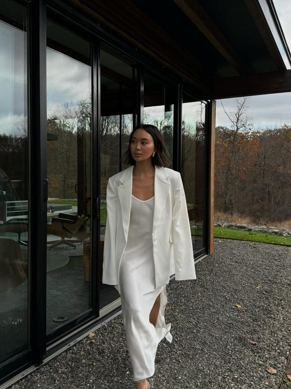 O slip dress ganha atmosfera mais sofisticada quando combinado ao blazer. A mistura de tecidos fluidos com estrutura cria proporção moderna, perfeita para quem quer elegância descomplicada.