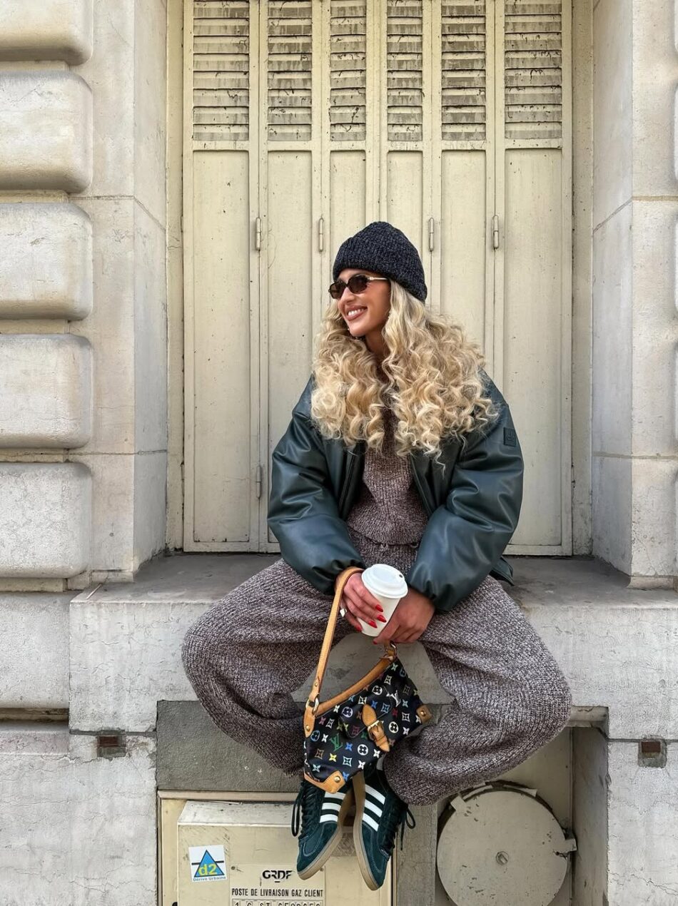 O casaco acolchoado combinado com conjunto de tricô e touca cria um look fashionista e comfy, com camadas e ideal para os dias mais frios.