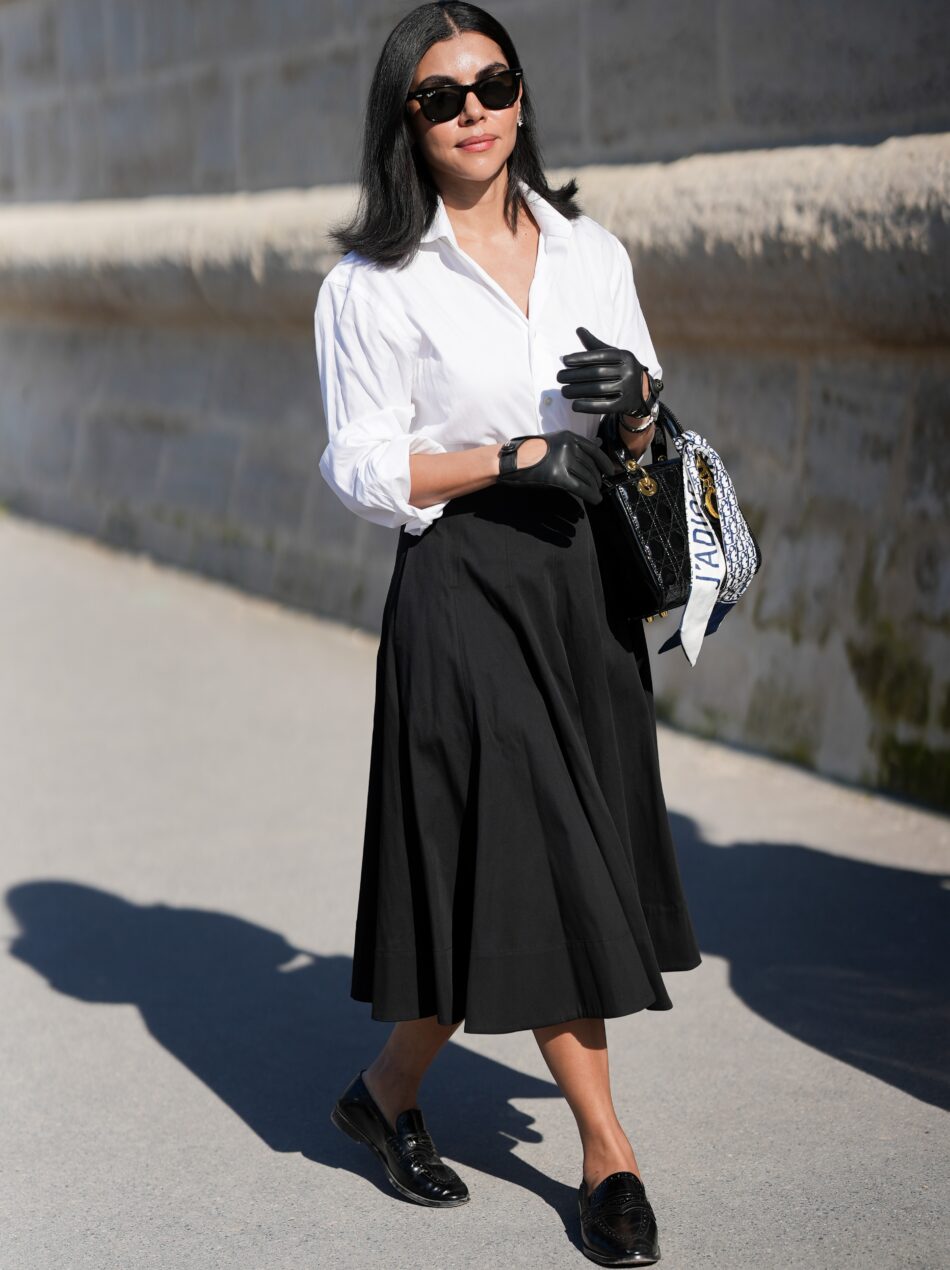 Eis a prova de que o New Look de Christian Dior é eterno! A ultrafeminina saia mídi rodada, com cintura marcada, fica plenamente adaptada a 2026 na companhia do mocassim e da camisa branca. O lenço e as luvas pretas adicionam atitude + estilo.
