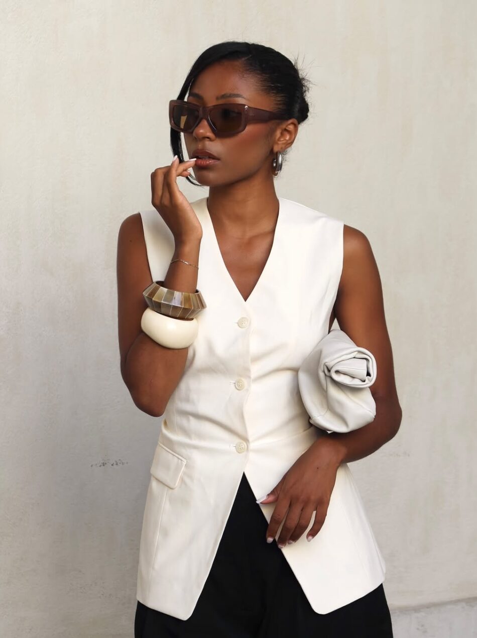 Uma troca fácil permite que alfaiataria faça parte do seu guarda-roupa de verão: a do blazer por um colete. A peça sem mangas pode ser usada aberta, sobre uma camisa branca, ou fechada, fazendo as vezes de blusa. Chique e versátil!