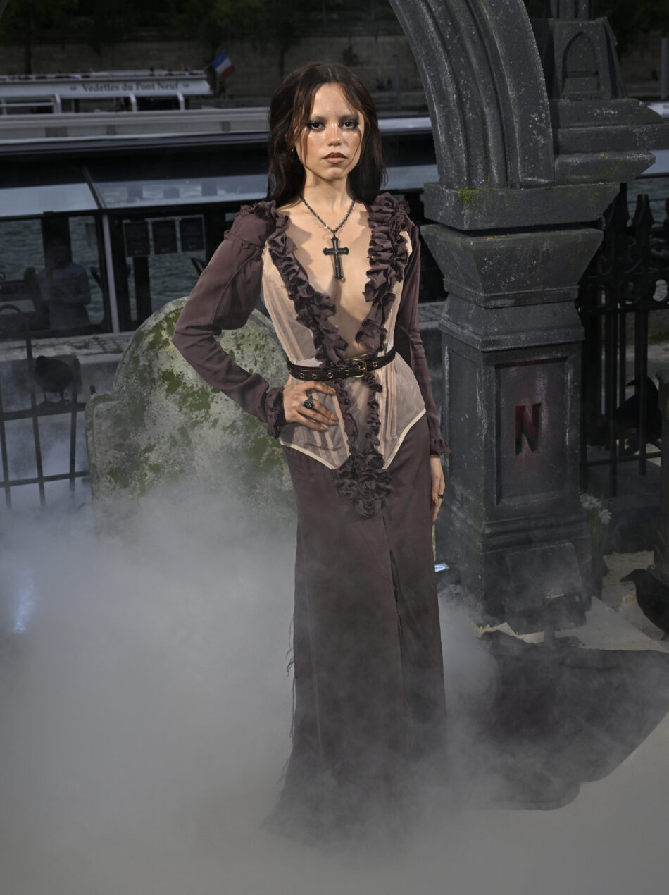 Vestidos longos com babados e colares de crucifixo, como os usados por Jenna Ortega, trazem um mood dark sofisticado, equilibrando drama e elegância.
