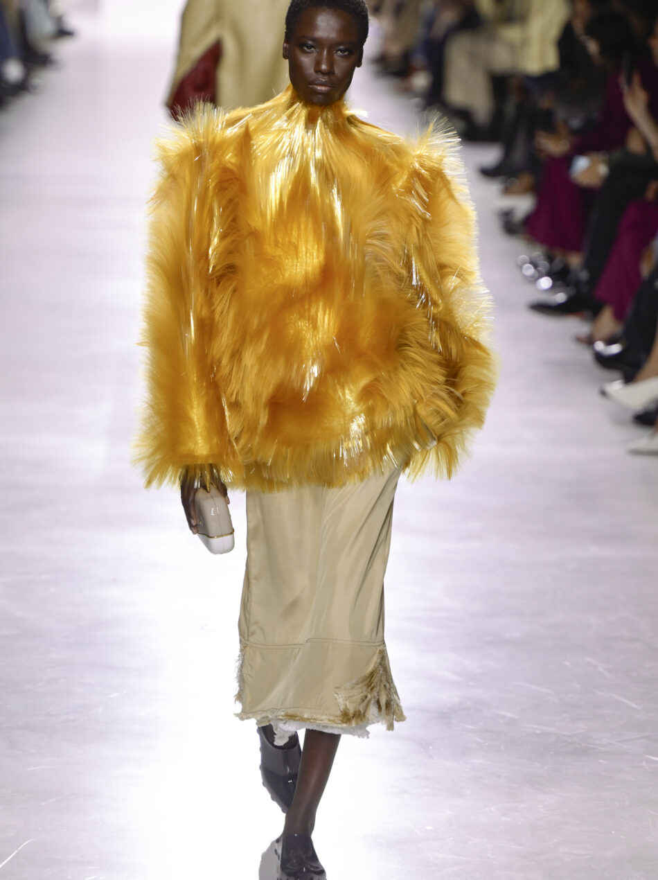 Louise aumenta o número de texturas com franjas, plumas, tecidos desfiados, felpudos e sobrepostos em finas camadas, tipo um folheado. Peças construídas com fibras ópticas em diferentes tonalidades remontam uma pelúcia plastificada, selvagemente contemporânea. Esses itens são combinados a outros aparentemente banais, como uma camiseta ou um moletom. O jogo entre o brilho e o opaco, o movimento e o estático chega a uma imagem forte. Louise diz com clareza a que veio, mesmo na casa conhecida pelo luxo silencioso.