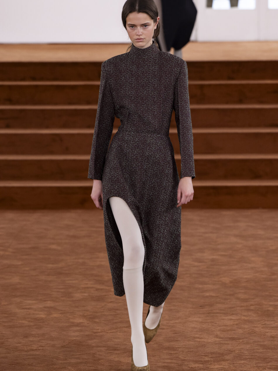 A busca pelo que não é perfeito traz ainda uma dose de sensualidade, que já havia dado as caras na estreia de Simone na Jil Sander, na estação anterior. Agora, no inverno 2026, há saias com talhos profundos nas laterais, tops que deixam grande parte do torso de fora e blazers usados só com meia-calça. Aqui, o estilista também joga com algumas texturas, como nos tweeds rígidos em conjuntos de blusa e saia, no jacquard inflado de um minivestido ou nos detalhes desfiados dos punhos de algumas camisas. O experimento atinge o ápice nos looks balonês volumosos e assimétricos.