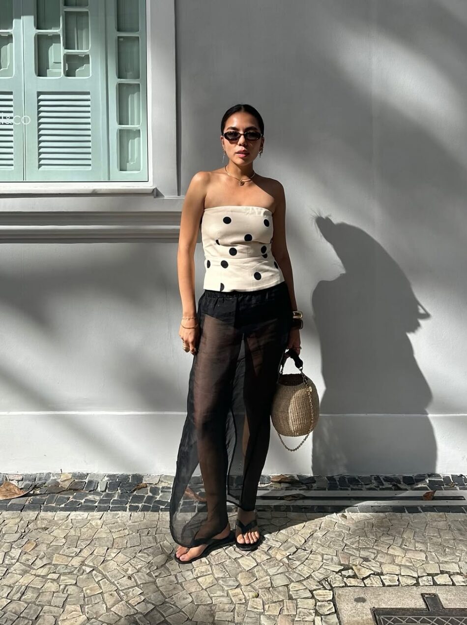 Na parte de cima, um bom truque é coordenar as cores da blusa transparente com as do top usado por baixo. Isso cria um efeito de sobreposição intencional e ainda facilita na hora de montar o restante da composição.