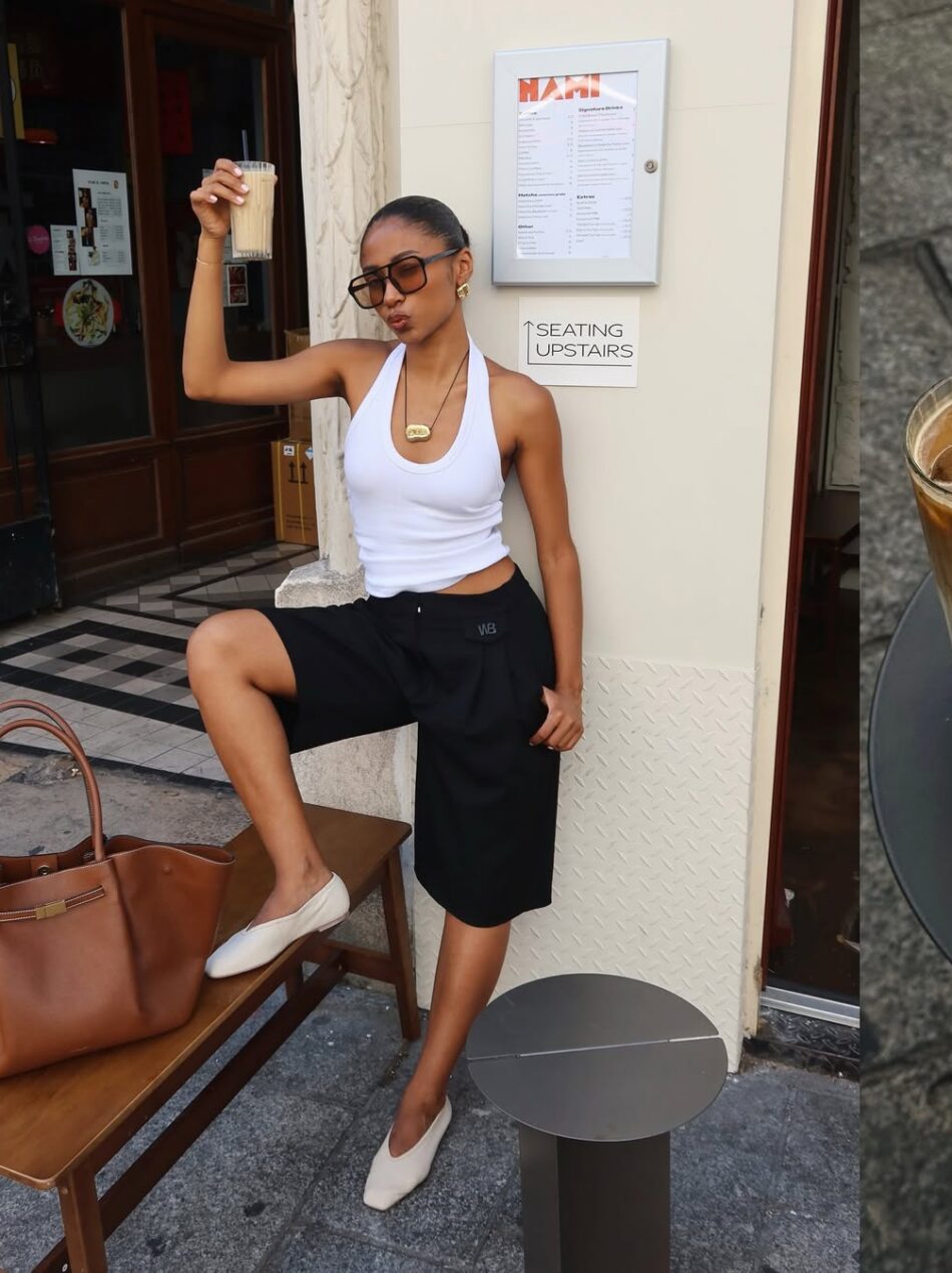 Os sapatos brancos são a escolha perfeita para quebrar sutilmente o clássico look all black sem perder a neutralidade e a sofisticação.