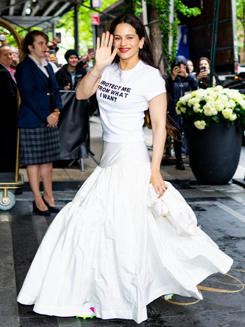 Cores e símbolos que representam a paz, com destaque para a pomba branca, também são recorrentes nos looks de Rosalía. Durante a temporada de verão 2026 da semana de moda de Paris, a cantora fez referências diretas e indiretas ao pássaro. É o caso, por exemplo, do vestido branco de Schiaparelli que trazia plumas acopladas no seu centro e laterais que revelavam um visual semelhante ao das asas das pombas. Em outros momentos da PFW, o elemento surgiu incorporado no formato de tiara e até de acessório para unhas.