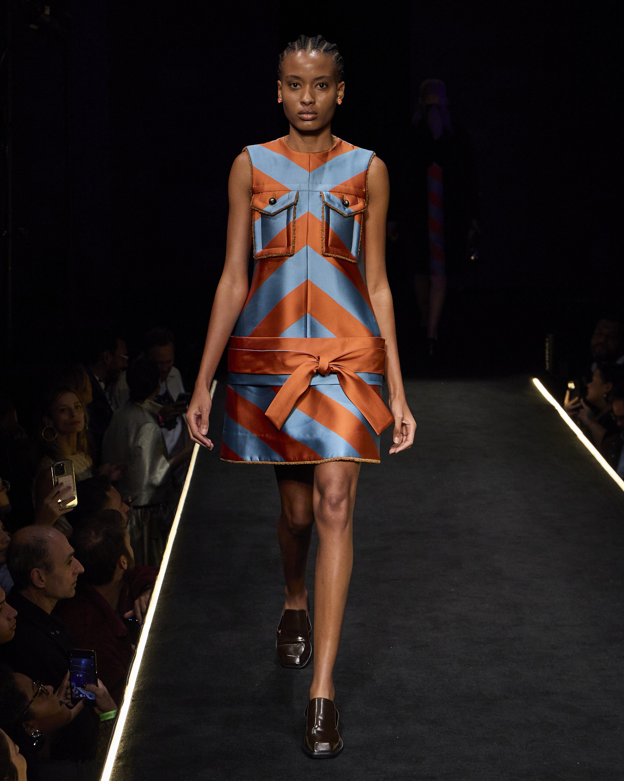 A apresentação é dividida em blocos. Primeiro, vem uma série de looks inspirados em camisas de rúgbi. As proporções são ampliadas, a modelagem é baseada em silhuetas geométricas dos anos 1960, mas com as mangas volumosas.
