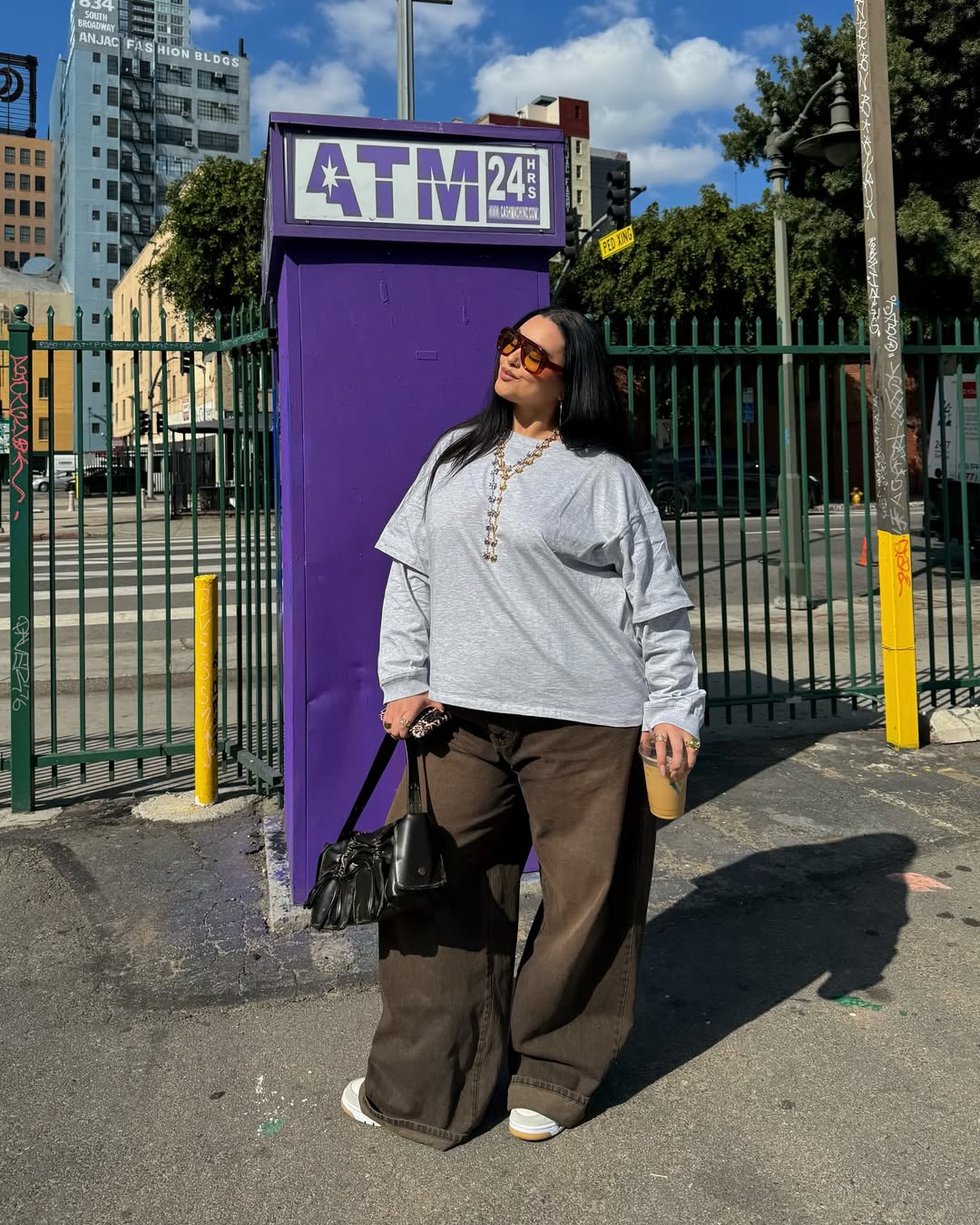 O truque de layering transforma o básico em styling inteligente. A camiseta sobreposta à manga longa, aliada à calça jeans larga, garante movimento e modernidade.