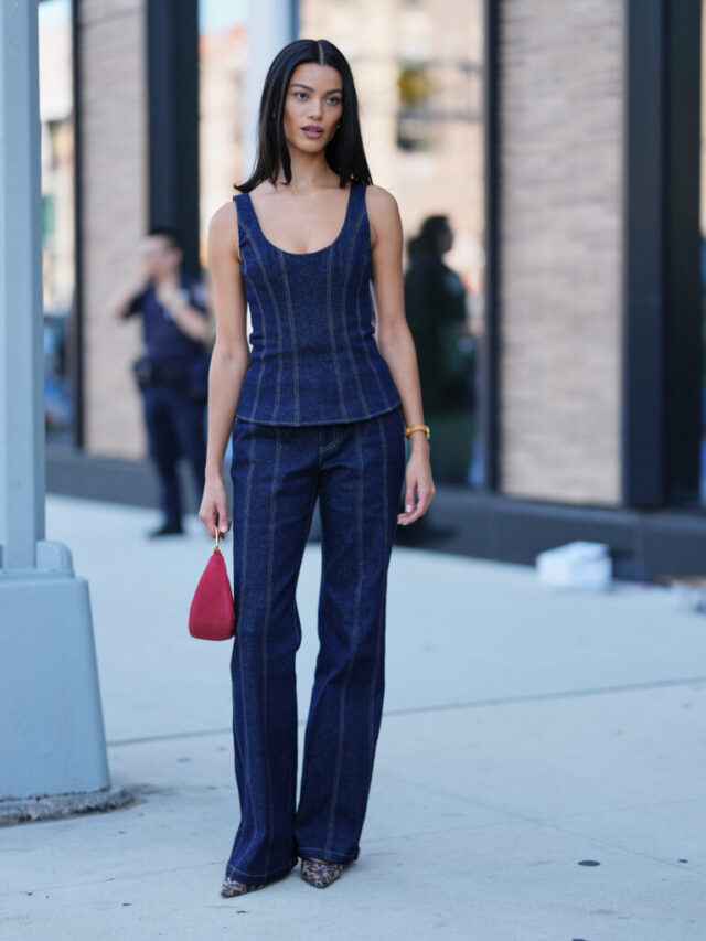 Conjuntinhos jeans são práticos e estilosos para a primavera. Aposte nas blusas estilo corpete, com costura aparente que valoriza a cintura.