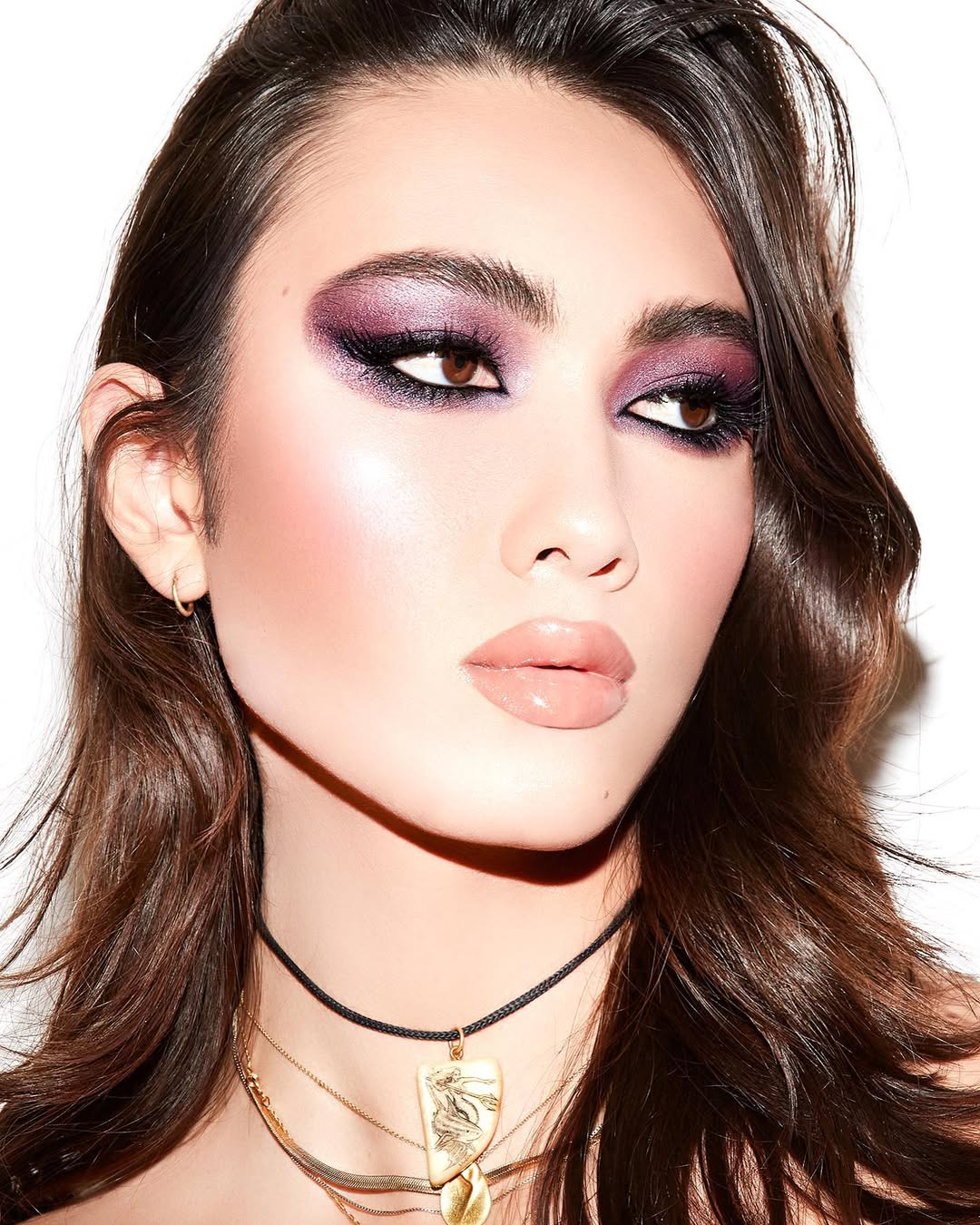 Entre os tons escuros, a sombra lilás aparece como versão suave. Combina com delineado preto e batom nude, unindo o gótico ao romântico e atualizando a estética sombria.