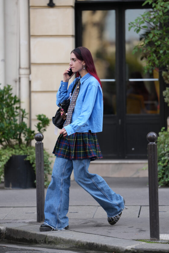 A sobreposição da saia sobre a calça é um dos recursos mais atuais de styling. Quando a saia xadrez feminina entra nessa equação, o resultado é um look ousado e urbano.