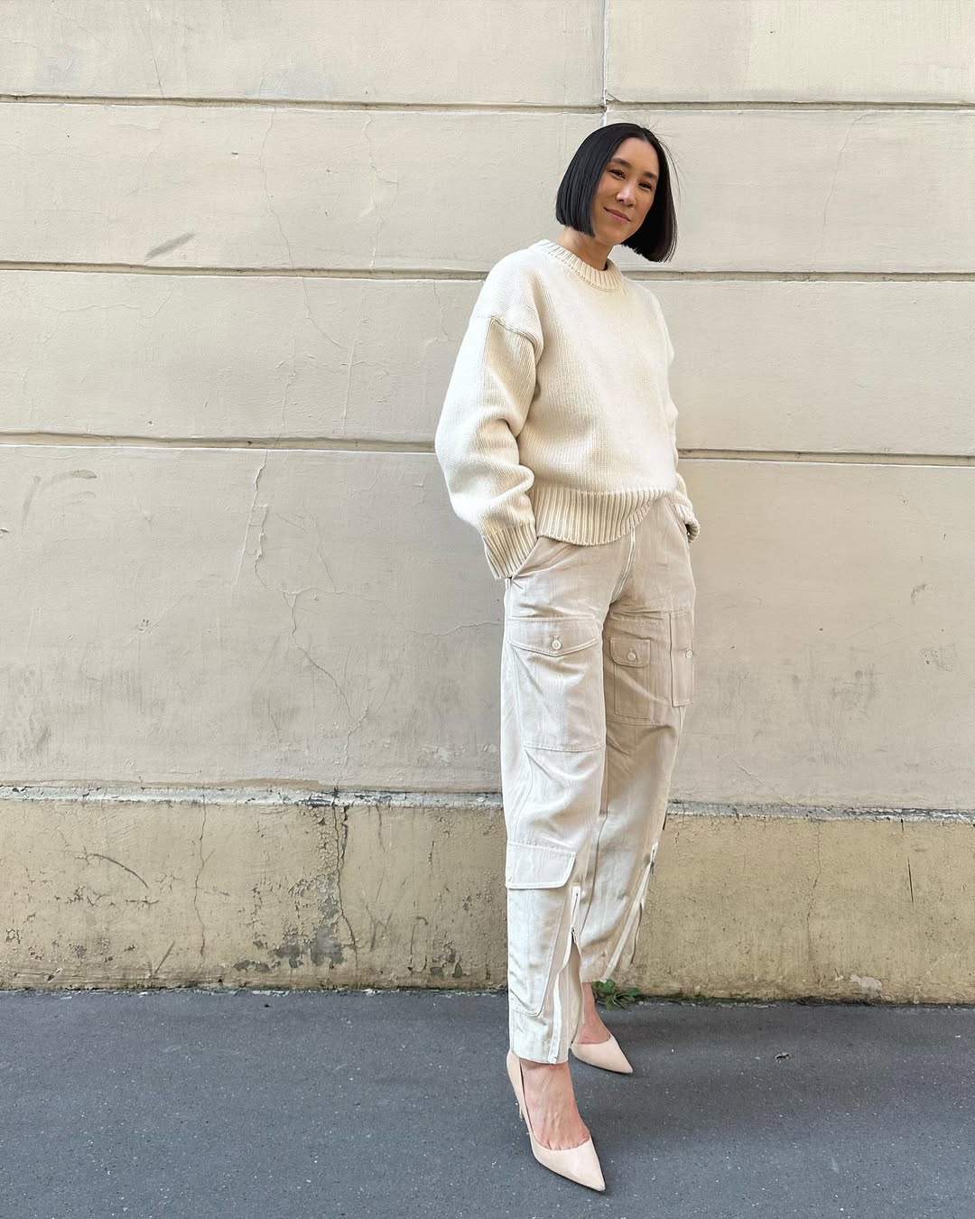 Eva Chen mistura peças casuais e elaboradas, como suéter pesado com saia leve e recortada. O contraste valoriza o look monocromático para um almoço arrumado.