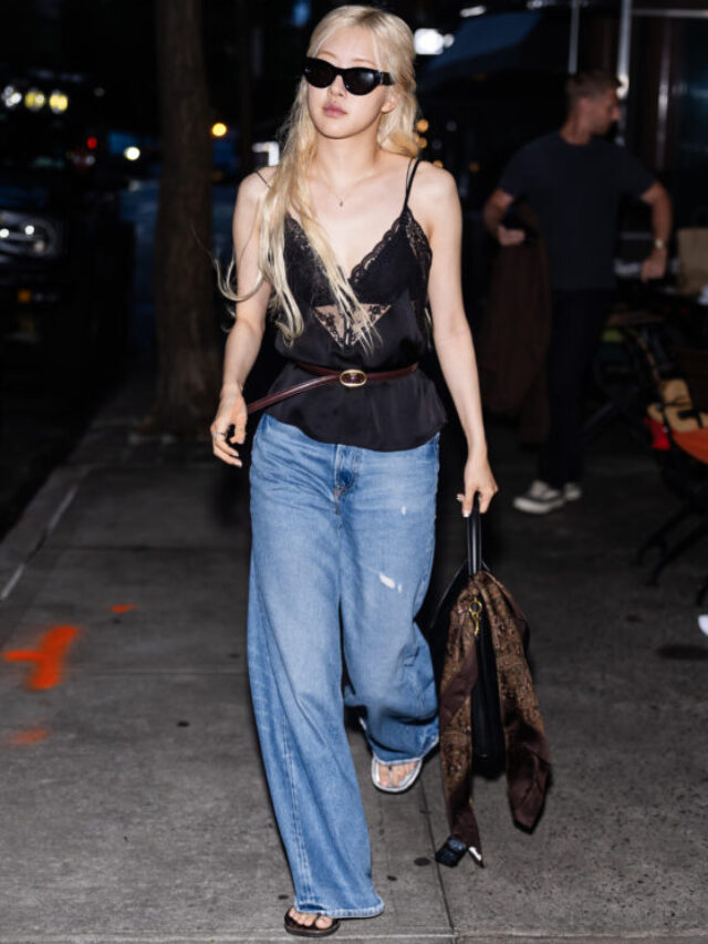 Rosé, do Blackpink, provou que a lingerie ainda é forte nos looks: blusa de renda tipo pijama combinada com jeans, trazendo o contraste perfeito entre delicado e casual.