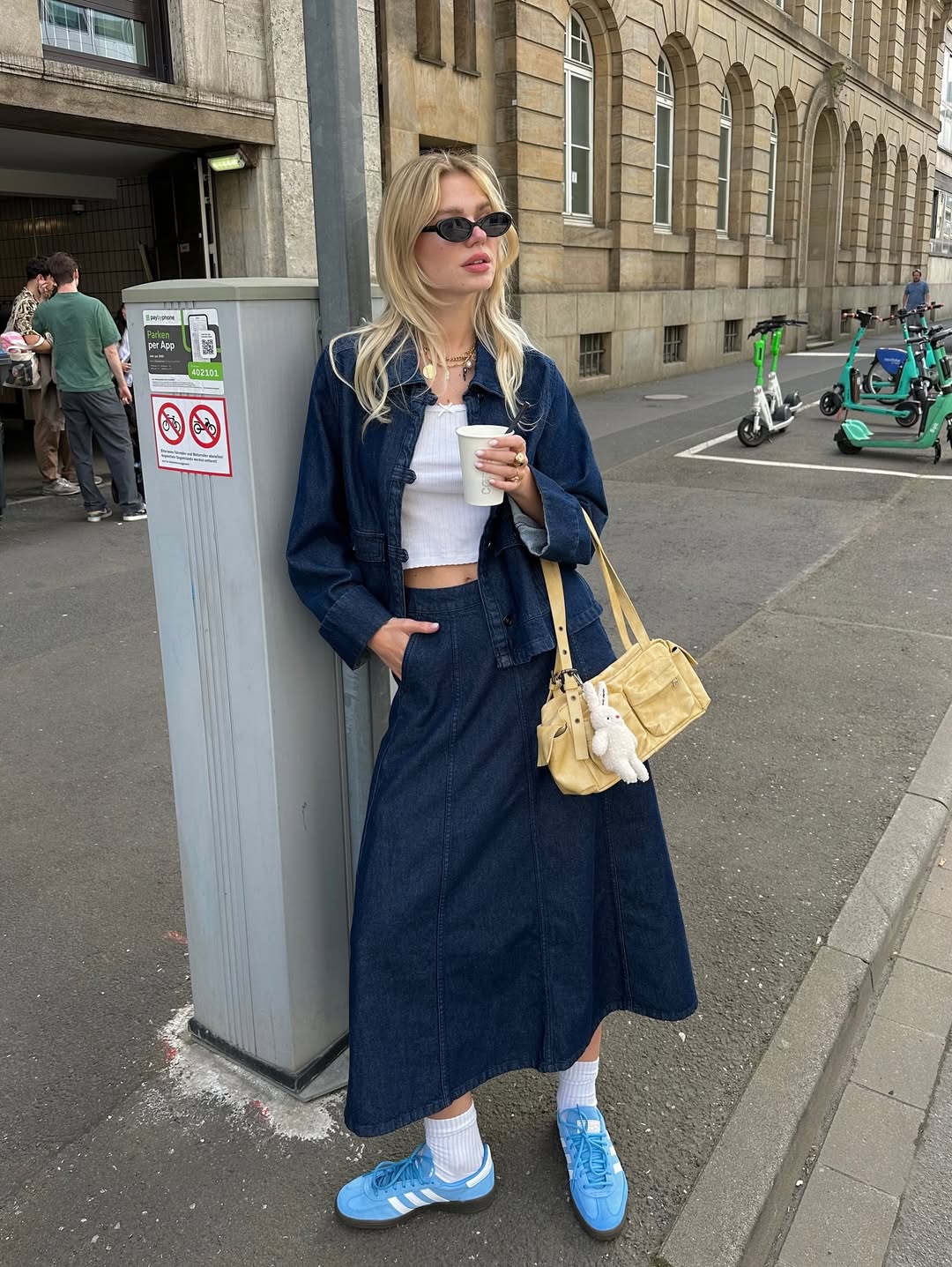 Levar a cor do tênis para outras peças cria unidade ao look. Aqui, o azul se repete em tons no tênis, na saia e na jaqueta, enquanto branco e amarelo trazem contraste.